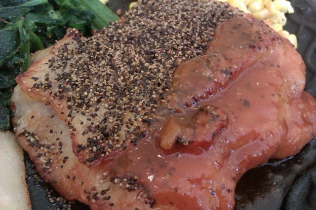 黑椒鸡扒,鲜嫩的鸡肉上面洒着好多黑椒,每一口鸡肉都混合着黑椒吃,有点辣,