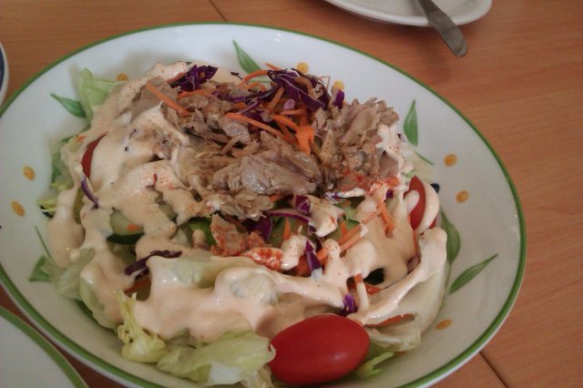 金枪鱼沙拉,点完没多久就上了,速度真快,金枪鱼的份量还真多,先吃肉类,