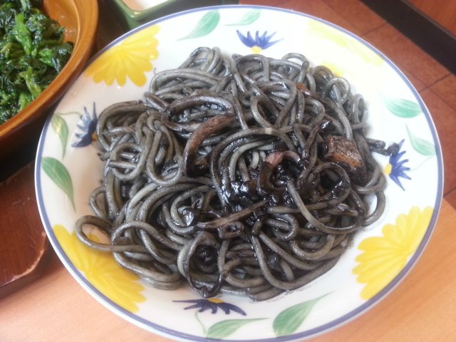 之前在香港某餐厅吃过这个。觉得很好吃!所以点了一份。不过果然一分钱一分货。跟香港的差太远了!嘻嘻。。。这个只是面黑黑的。根本没有墨鱼的鲜甜味。就是黑色的意粉吧。。。