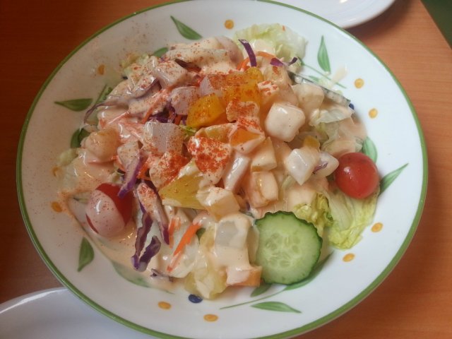 点了一个鲜果沙拉。才6元。分量不少哦!有罐头的水果和很多新鲜的蔬菜。好吃!