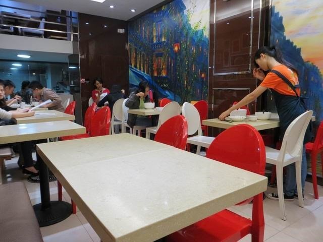 长方形的店面,一眼望尽头就是厨房了。环境就是干净简洁。二层是隔壁店的,不可思议。。。