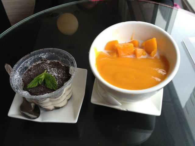 我们分别点了“奥利奥莫斯布丁”和“芒果河粉”。“哇嗷~!!上菜噜~!!!”(其实是上甜点,哈哈)看到卖相就很不错,很好吃的那样子。。。我先尝一口布丁,入口即溶,滑而不腻,不太甜,我最喜欢这样的甜点了,还有香香的奥利奥味道~!!