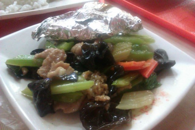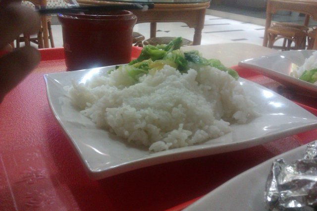 米饭很大一碟,雪白雪白的,将菜汁淋在上面一起吃味道更好。