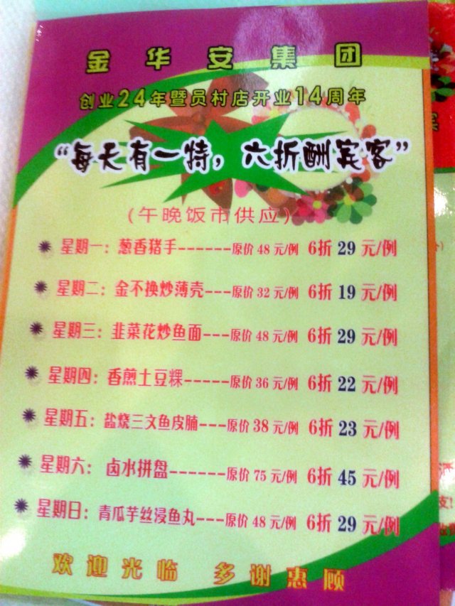以165元团购了金华安价值330元4人套餐。于中午时间过去,那里人很多,原来是他家搞周年促销活动,还推出不少特价菜。