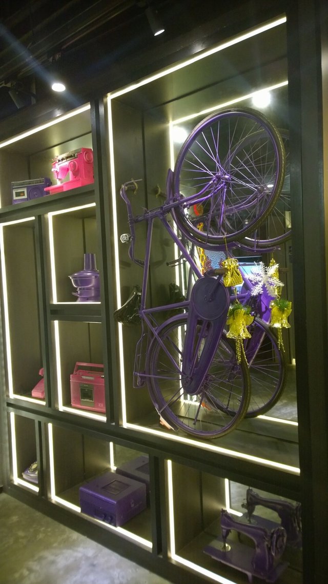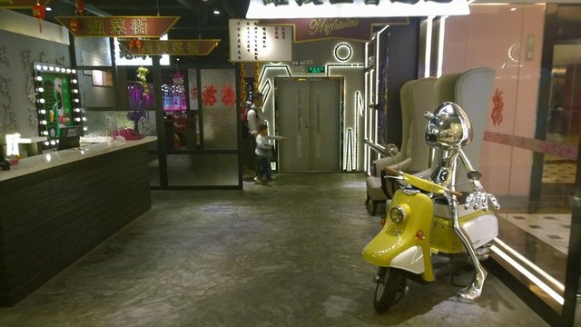 一踏入他家,扑面而来的是浓浓的还旧气息。门口是挂满了香港街名的指示牌,再进去一点,左边是宽大的收银台,台上摆了旧式的台扇和英文打字机;右边是一辆黄色的女式小绵羊摩托车;摩托车的旁边是两张靠背很高的扶手椅;椅子的旁边是个陈列馆,里面摆了自行车、录音机、拨号式电话。