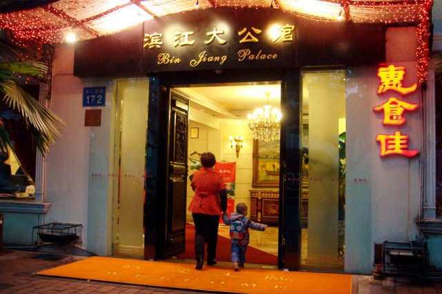 沿着滨江一直走,就见到这白色洋楼,侧面大大的“惠食佳”招牌,正门不大,两扇雕工考究的西关大门,抬头见“滨江大公馆”……