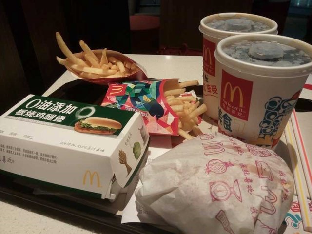两个人中午来麦当劳这里点了套餐,正佳这里的麦当劳人很多,座椅不够,点餐都要排队等好久,不过店员态度都不错,上餐的速度很快,卫生做的还OK。板烧鸡腿堡分量还是足够大的,里面的鸡腿很烫而且肉质很嫩滑,非常入味,中间夹的生菜好新鲜。薯条多年来味道都是那个样子,确实很吸引人,就是感觉薯条有点缩水了。
