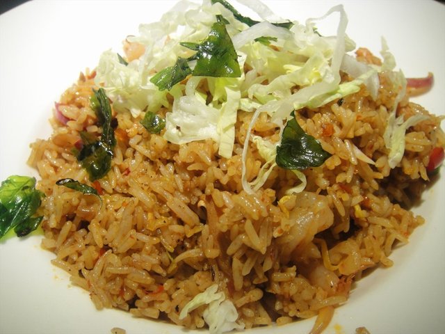 印尼炒饭:用料十足的炒饭,用桂林酱和虾等海鲜,再加上各种香料炒制而成,饭粒干爽不黏糊, 有嚼头,香香辣辣的,好正。