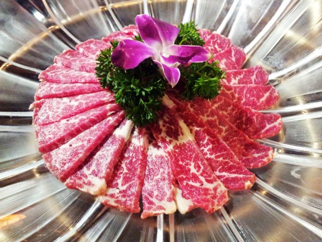 先来雪龙5A,“雪龙”牛肉纹理非常漂亮,以大理石纹居多,外界称呼为雪花、霜降、雪龙。5A是牛肉品质的划分等级,5A称为上等。尝雪龙5A,五个字:味蕾的恩赐。