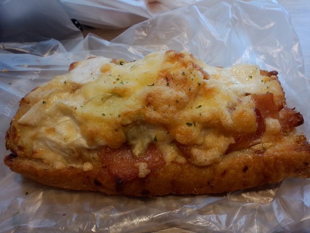 造型萌萌哒,表面的好像是沙拉酱一样的东西我也不爱。里面就是培根夹心的面包,感觉一般,普普通通的。还是甜味的面包比较适合我。