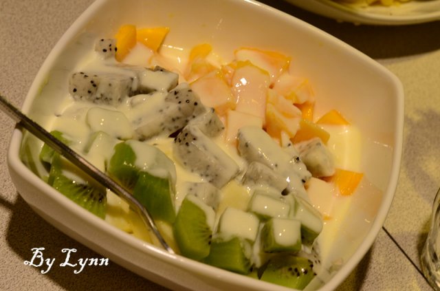 然后上了水果沙拉。值得赞赏的是这里的水果都是客人点了之后再出去新鲜买回来的,然后有些甜品的食材有点不新鲜了,店员很老实的说出来,希望客户换别的保证甜品的出品。