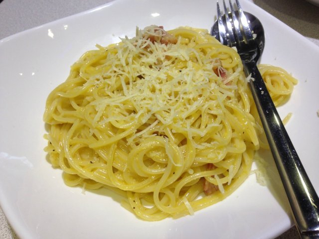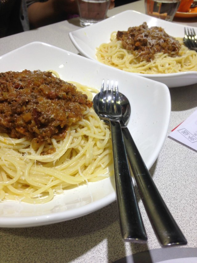 主食选择大家都对卡邦那和肉酱意粉情有独钟噢,首先上来的是肉酱意粉,芝士恰好融化在肉酱上面十分诱人,忍不住在这美好的时刻大口大口地食,咔擦咔擦完一番,搅拌搅拌,待酱充分和意面融合在一起就可以开动了!肉酱很惹味可口,芝士味不会太抢,若你喜爱芝士多一点的话,卡邦那就更适合你,每根意面都沾满了浓稠的忌廉酱汁,洒上芝士碎,阵阵飘香,大呼满足!