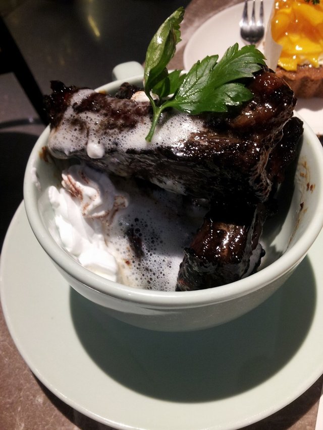 咖啡骨:风评两极化的一道菜,因此尝试的时候很是忐忑。肋排十分肥美,熬制之后酱香也很入味。入口后临尾会有咖啡的苦涩味,因此最好是蘸上忌廉来送,虽然就算这样还是觉得挺苦的,而且没有咖啡香是很大的败笔。这个最大的问题是太咸了,不送饭的话很难吃得下去。