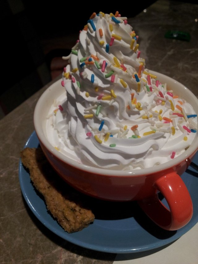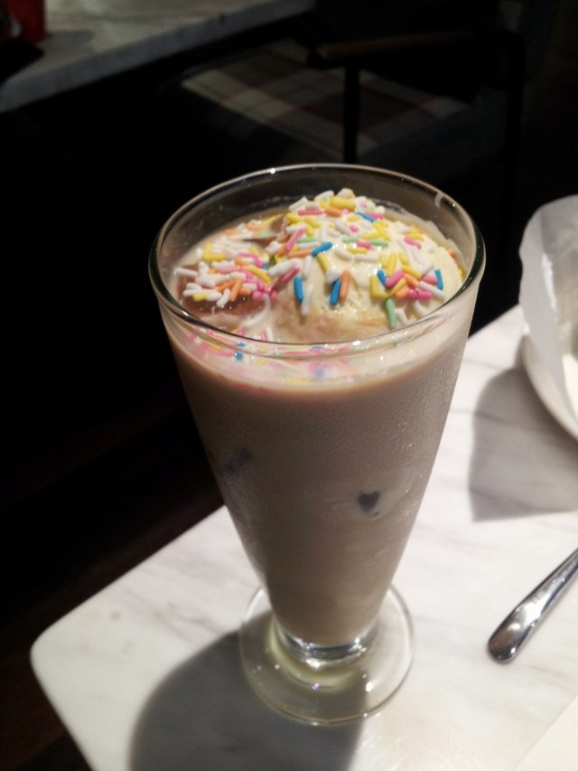 西班牙咖啡:另一款花式咖啡,简而言之就是咖啡冰沙。打制的时候加了少量冰淇淋或者忌廉之类的东西,因此比之常见的咖啡冰沙在口感上要来得幼滑。甜度刚刚好不高不低,因此是适合搭配甜点类的一款特饮。