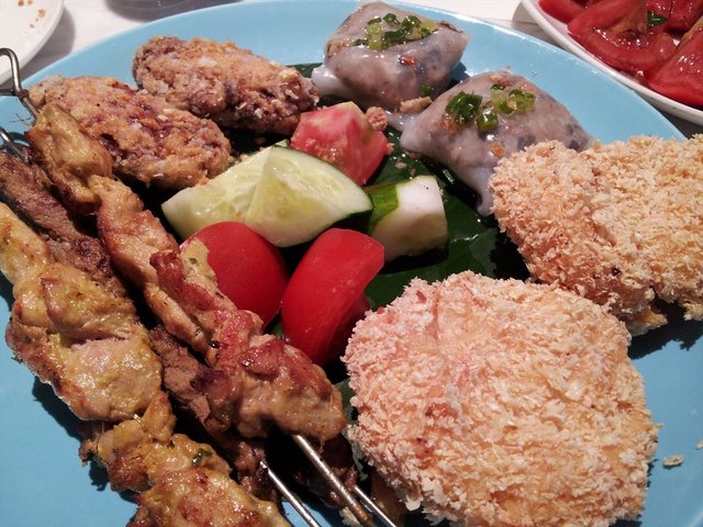 越式拼盘:包括四款小食——越南粉包、什锦沙爹、越式牛油鸡翼和泰式炸虾饼。什锦沙爹就是烤沙爹肉串,鸡肉和牛肉两种,味道还可以,不过沙爹味比较淡。牛油鸡翼是用牛油炸过的,因此虽然很香脆,但也比较油腻。越南粉包看着样子挺有意思,味道上却没什么出奇的,蔬菜丁清脆的口感其实跟软塌塌的外层粉皮并不太搭调。炸虾饼是这套拼盘里面最好吃的,外壳炸得又香又脆,内层又很Q弹,有点像潮式菜中的炸虾枣的感觉。