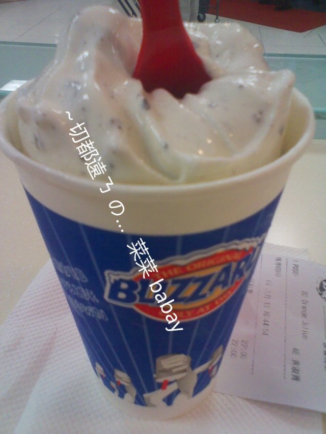 这家店店面不是很大哦!正好是生日月,有收到DQ的短信,所以可以免费吃了哦!要一份标准杯的奥利奥暴风雪,很快就做好了,给我的时候还是一样倒过来的,尝试了一下,口味确实不错呢!奶味真的很浓,而且里面放了很多奥利奥的饼干削,很好吃,基本每口都吃得到。DQ的雪糕味道一直不错,上次尝试的芒果芝士的也很好吃哦!