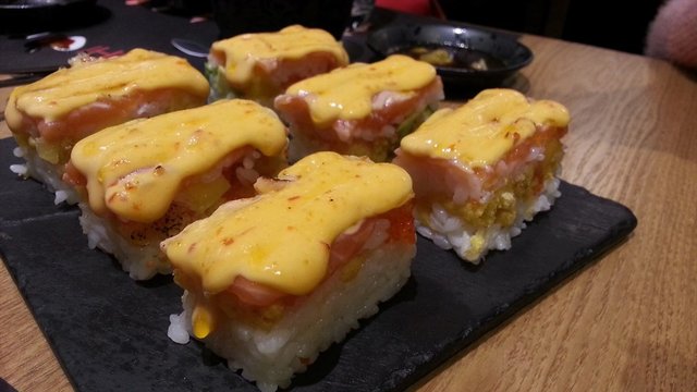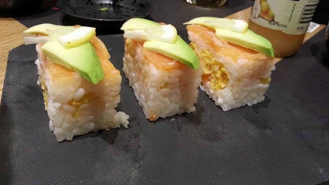 牛油果三文鱼千层:这个寿司比较特别,中间夹的是粟一烧,上面的三文鱼切的比较薄,牛油果味道还不错,寿司总体吃起来口感有点特别。