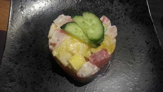 吞拿鱼塔塔:这个造型也是一个心形,主要由水果和少量的吞拿鱼弄成的,里面的水果挺新鲜,挺受朋友们的喜欢。