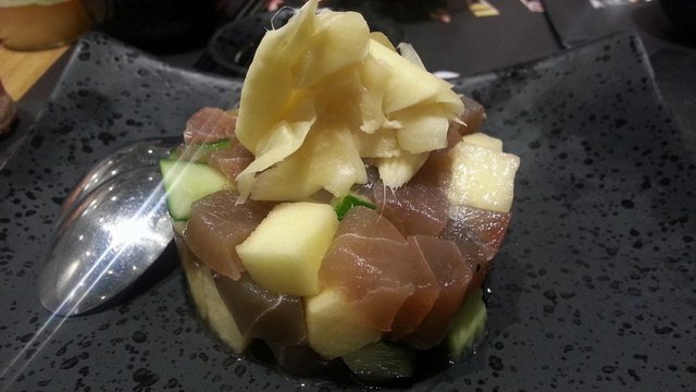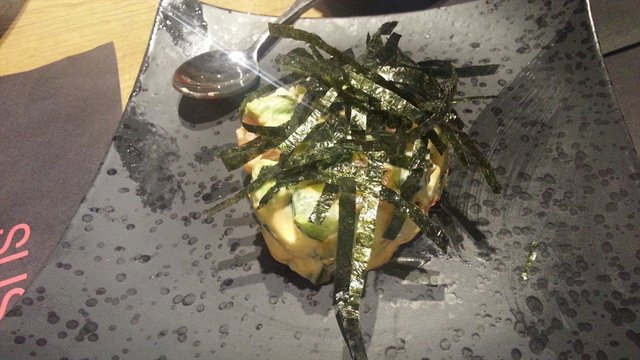 三文鱼塔塔:这个塔塔上面铺的紫菜碎,有点杂乱无章,有个朋友还亲自用筷子再清理“杂草”。总体味道一般般吧。