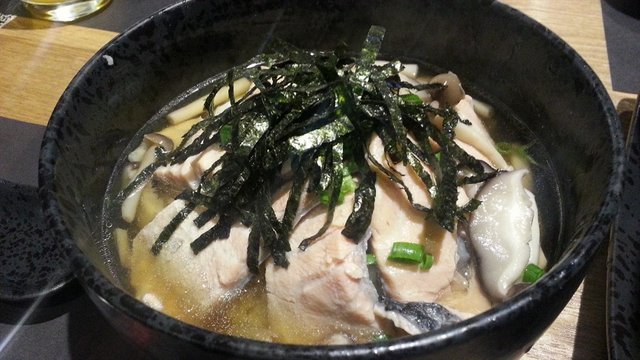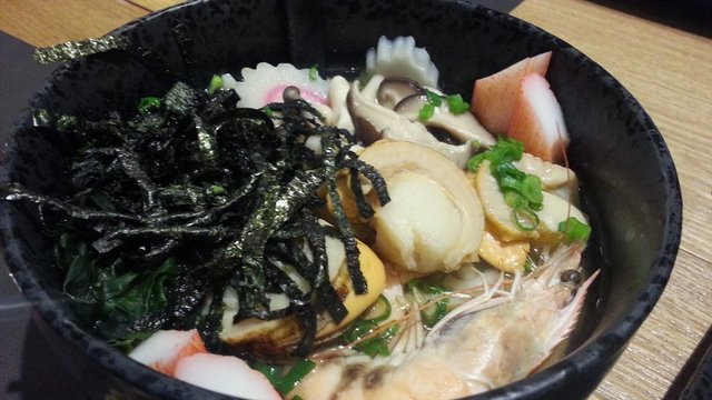 海鲜乌冬:食材都比较多,有帆立贝、虾、蟹柳和紫菜等等,乌冬面分量也不少,味道总体还不错。