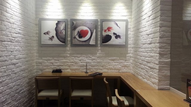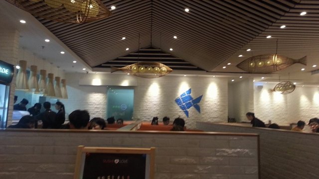 sushi love装修style比较简约,里面见到最多的图案就是鱼,无论墙壁的墙纸、壁画还是灯具都与鱼有关。