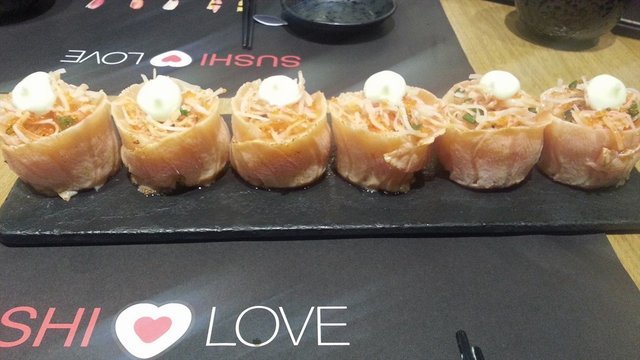 蟹肉三文鱼彩虹卷:造型跟花之恋差不多,有点像rose,外面的三文鱼是烟熏多的,我喜欢先吃光外面那层,然后最后再吃中间的饭团,中间的饭团压的不是很实,很容易散架。