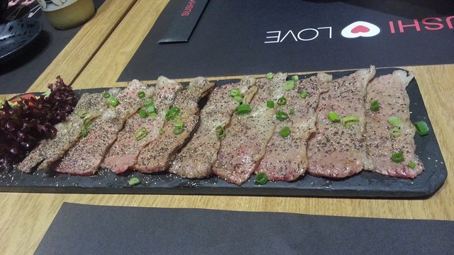 葱烧和牛刺身:造型还不错,另外装食物器皿比较特别,服务员端上来的时候,还以为旁边会比较烫手,但是用手触碰感觉没有想象中那么热,器皿有点想石砚,和牛上面撒了黑椒和葱粒,和牛比较薄身,一筷一口,味道总体还行。