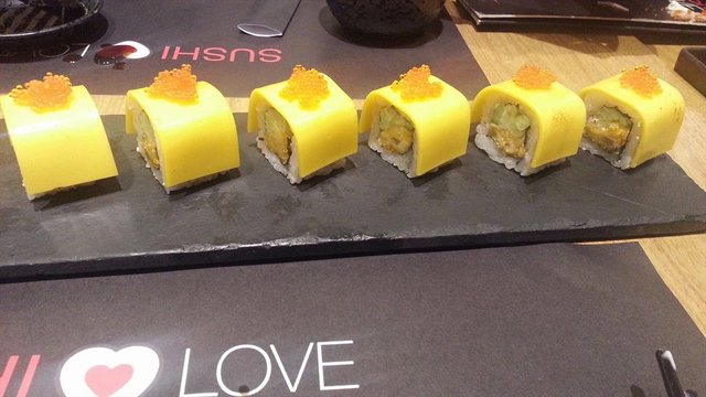 芝士海虾天妇罗卷:芝士味道也挺浓郁,上面还是有蟹籽作为装饰,中间的海虾味道还行,饭团压的比较实正。