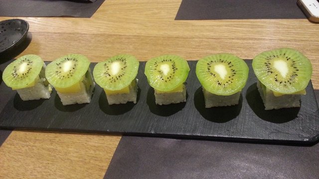 夏威夷加州卷:这个寿司造型比较特别,上面用kiwi铺在寿司上面,分量一口就能吃得下,kiwi有点酸,寿司饭压的还比较实正,口感总体还行。