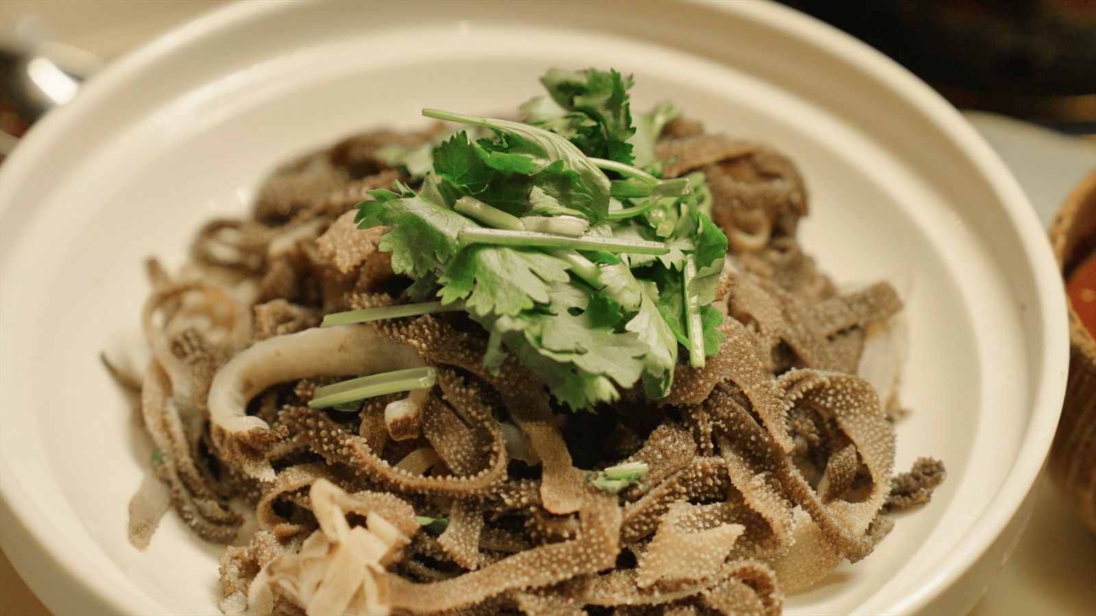 選用新鮮毛肚製作,蘸料由芝麻醬、花生醬加腐乳調製而成,味道十分正宗。做法講究快涮快上,毛肚在水中「七上八下」即可熟透,全程現切現爆。吃的時候一定要趁熱,裹滿麻醬一口咬下,香氣十足!爆肚是清末民初回民發明的吃食,將牛羊下水收拾干淨後用開水一燙即可,口感鮮嫩又價格實惠,深受老百姓喜愛,後來火遍廟會、街邊攤,如今也已成為館子裡的招牌,吃的就是這口原汁原味的北京味。