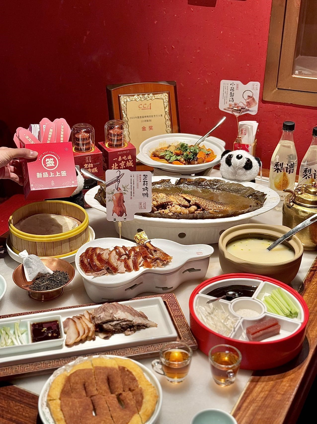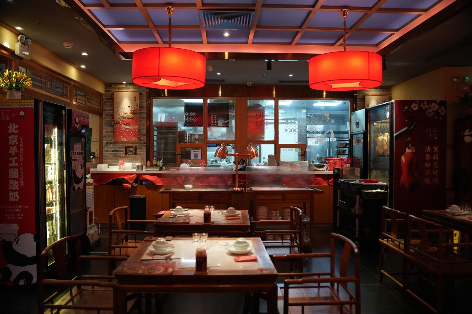 走進店鋪,朱紅與原木色構成的主調溫暖質樸,門頭木招牌搭配暖燈,仿佛走進一座北京小院。天花板懸掛的紅燈籠、青磚牆面鑲嵌的雕花窗棂,處處彌漫著濃郁的京韻。開放式廚房旁的紫銅吊壺格外惹眼,滿是儀式感。大廳桌距寬敞不擁擠,設有獨立包間,門口還設有木質長凳等候區。入座即送上熱梨湯,師傅還會推車現片烤鴨,暖光柔和,服務員身著中式制服,湯香混著煙火氣,溫潤治癒,充分體驗沉浸式京味。