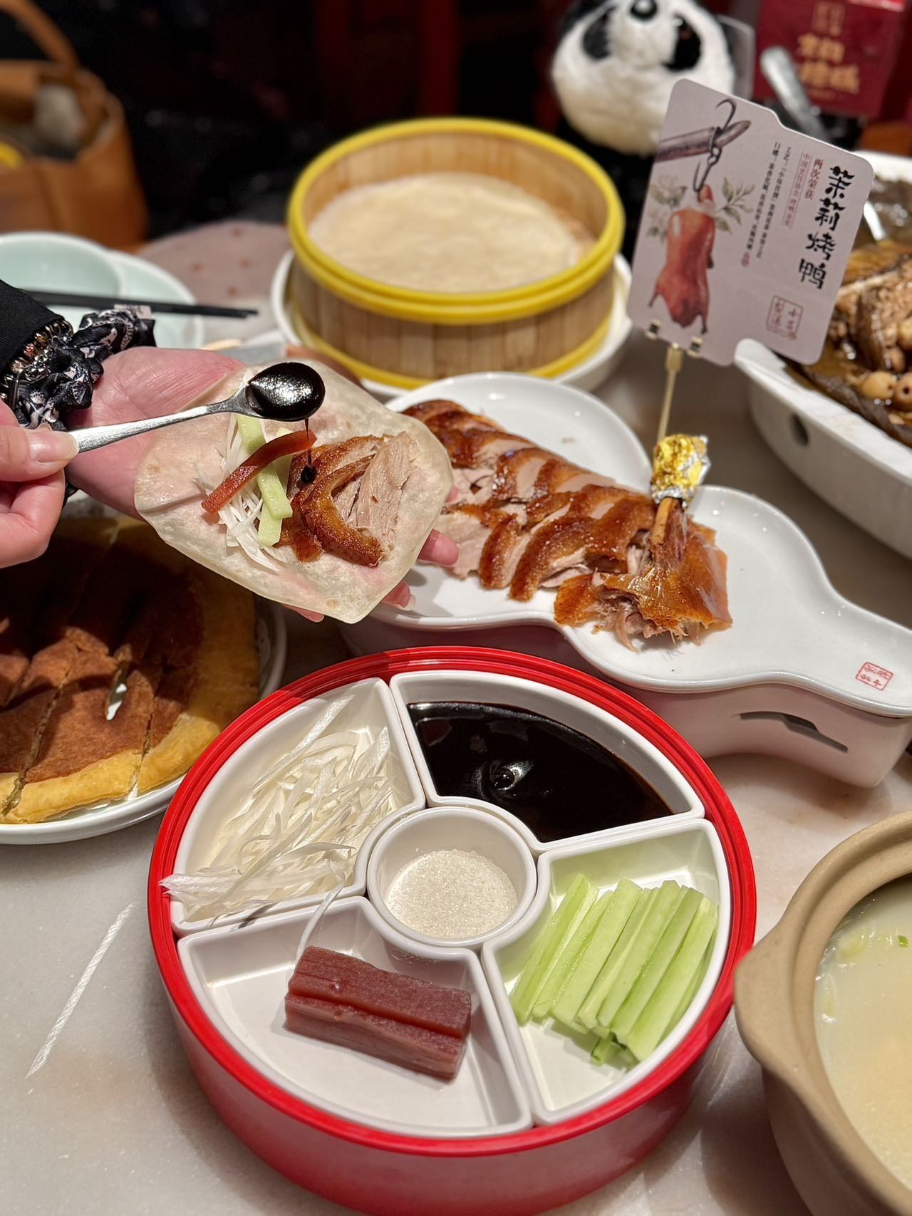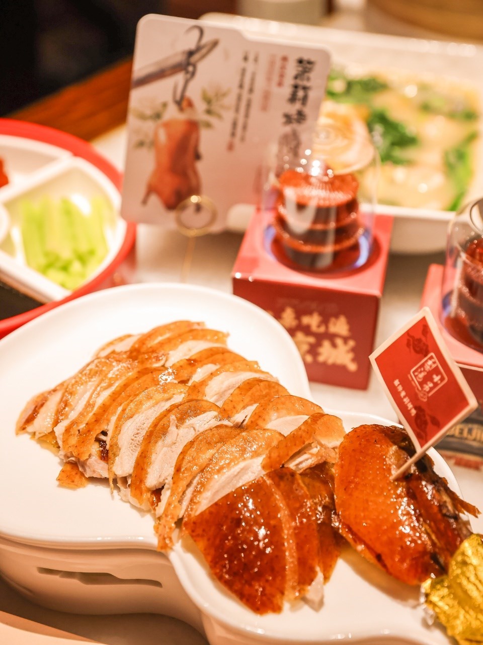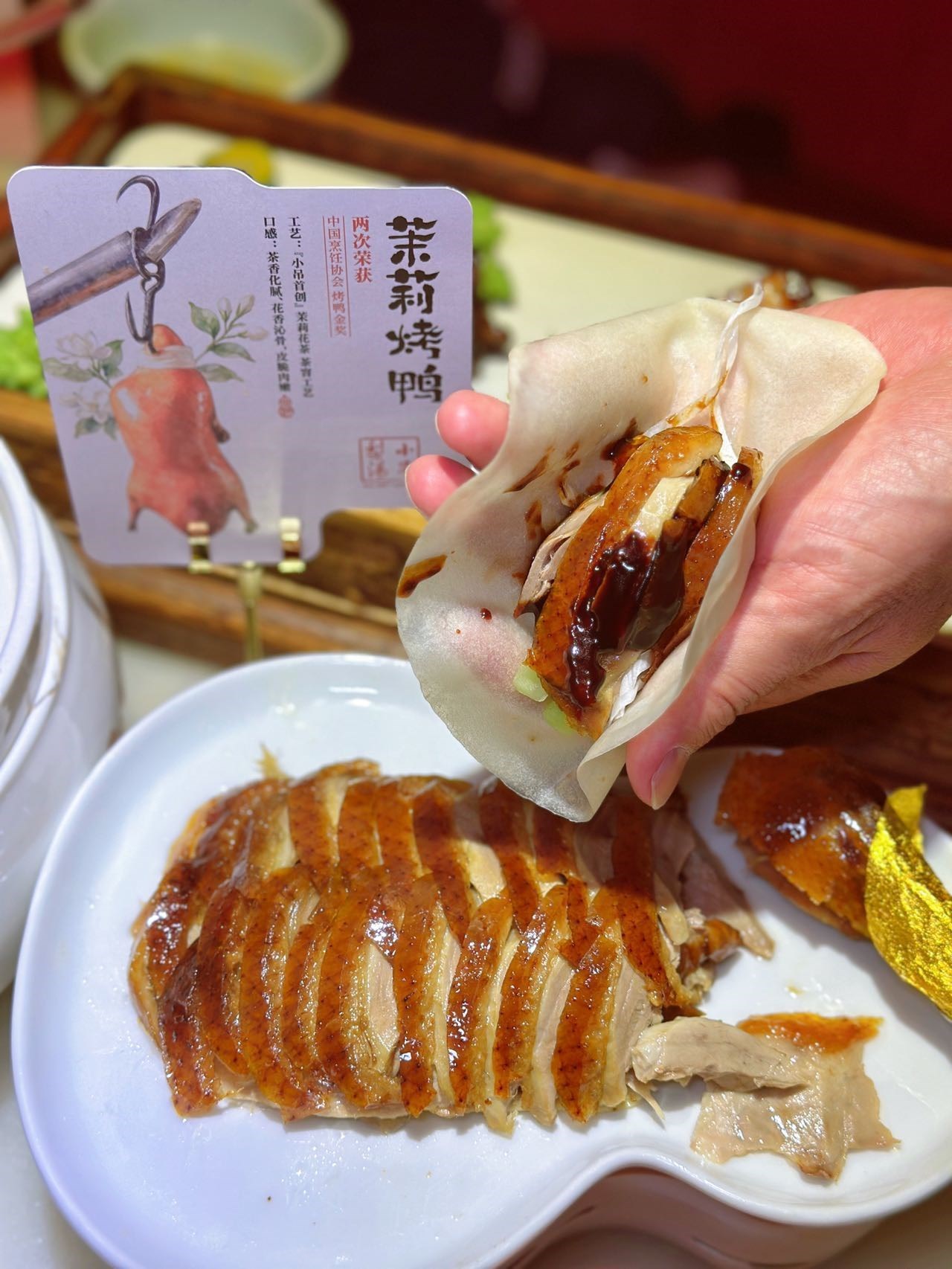 這道拿過中國烹飪協會烤鴨金獎的菜品,是北京烤鴨的創新款,由小吊梨湯首創。將茉莉花塞進鴨肚子裡,再用200℃掛爐烘烤,出爐後即刻切片。入口不僅能品到烤鴨的皮脆肉嫩,還能嘗到茉莉花的清香,解膩又獨特,花香早已滲入肉中。北京烤鴨歷史久遠,南北朝時就有「炙鴨」,明朝時成為宮廷菜,搭配薄餅、甜麵醬、蔥絲和黃瓜條食用,一口下去超級满足,可謂妥妥的北京名片!