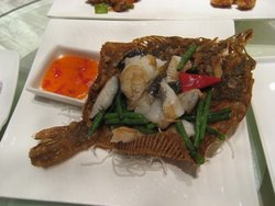 一口猪千禧大酒楼的粤菜是挺新派的做法,装修也挺上档次的。酸菜烤五花肉够特别了吧,48块钱,五花肉是独立烤制的,其实效果和猪颈肉也差不多,只不过多了点肥肉而已,酸菜很香,酸味倒是不太重,主要是咸味。骨香多宝鱼我也是挺喜欢的,多宝鱼的肉是够细嫩的,而且油炸过了以后鱼肉都是挺固定的,鱼骨头都是中间的一根了。查看更多