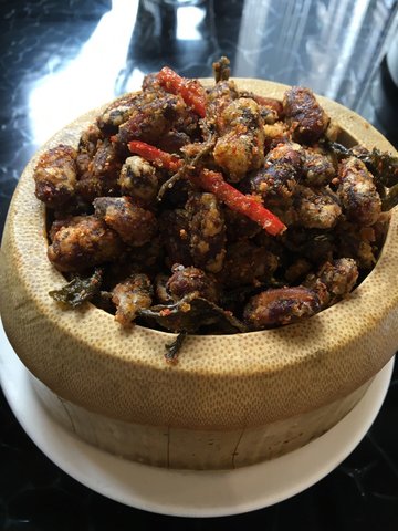 这家店位于工人体育场北路21号屯三里购物中心。主打云南菜,餐厅的装饰和服务员的穿着都很云南,有种寨子里的感觉。他家的菠萝饭味道不错,米饭很香,里面混合着大块的菠萝肉,酸甜口感很好吃。强推傣家野生珊瑚菌,是一种菌类,口感很不错,味道超级辣,很下饭。傣家米酒味道很像醪糟,是装在竹筒里的,倒出来颜色透明中带电白色,味道还可以。还有一道版纳酸角煮鸡感觉不错,和酸汤鱼的酸味有单类似,是番茄味道的那种酸,鸡肉很鲜嫩,分量不大。人均八九十左右,性价比中等。