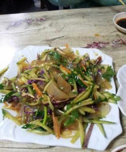 之前武汉的东北家常菜馆特别少,现在越来越多了,这家据说很正宗。我们点了不少招牌推荐菜。锅包肉,好像每一桌都点了,分量很大,酸酸甜甜的,很好吃。东北大拉皮,分量很足,拉皮很劲道,比凉皮要好吃,里面还有紫甘蓝和花生米颗粒。炖肘子,这个一般了,个头大,但味道太咸了,最后都剩下了。