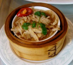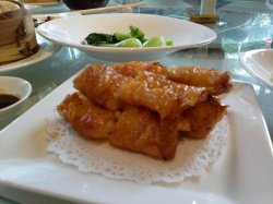 这家店看着非常高档,糕点是一绝! 这名字听着就不错哪,尤其是有我最爱的虾虾在里面,每一笼都有四个烧卖,卖相非常的好看,上面点了些橙黄色不知道是什么的东西【可能是蟹卵】,但还挺好吃的,每个烧卖大概塞了3颗虾仁,油炸过的,酥脆酥脆的,值得尝尝! 荷叶粉也很不错,个头挺多还挺大,我都把它当成主食了,外面是用的真的荷叶包裹住,像粽子似得,里面是糯米,粘粘的,加了,猪肉,冬笋之类,咸味的,虽然有荷叶的鲜香,但我不太喜欢呢!如果是甜的就好了。 雪梨炖雪耳好吃,对粥类没有抵抗力呀!银耳炖的很烂,和雪梨完融为一体,滑丢丢的,带点胶质,又有果冻的爽滑感,女生会喜欢的。 叉烧酥,味道不错,甜味带点咸味,和“味多美”的一口酥有得一拼。金黄色泽非常诱人,外皮酥脆,里面还加了一些东西,表面的芝麻非常好吃。 萝卜糕,火候有点过了。 虾饺也不错呢。查看更多