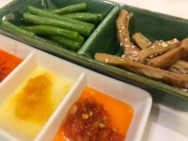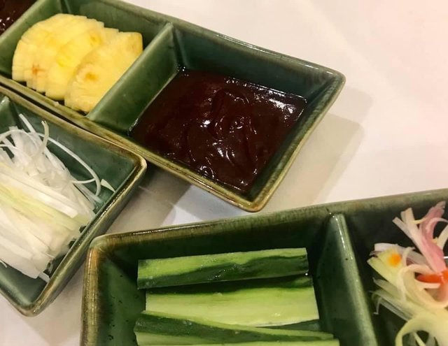 乳豬醬、芥辣、茄汁、菠蘿、京蔥、白蔥段、青瓜條