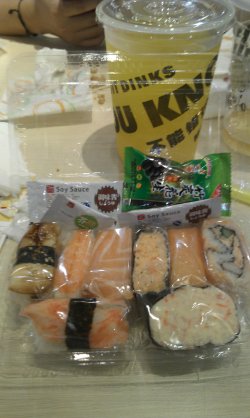 就是一家自选式的寿司外卖窗口,寿司种类不少,价格不等,1元到几元都有,肉的相对贵一些,不同口味选择性多,喜欢土豆沙拉口味,上面有一层厚厚的土豆沙拉,沾着酱油混合着芥末,一口吃下去很过瘾,泡菜口味有点酸辣味很好吃、金枪鱼口味的寿司上面有一层厚厚的金枪鱼沙拉,沾着酱汁很鲜美,。总之,花20元左右就能吃饱,感觉口感还可以,性价比高,味道也不错。查看更多