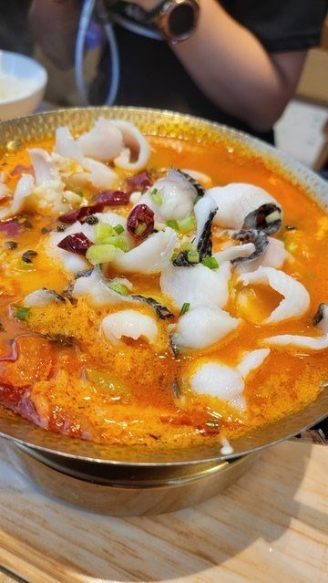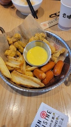 小朋友可以選擇呢度既兒童餐19蚊人仔有麵有菜有小食有甜品同玩具小朋友最開心包漿豆腐味道不錯是很撈飯的餸菜雲南木姜子酸菜魚魚肉片真的沒有骨,滑滑的很鮮嫩呢個系雞湯豌豆菜心¥18菜心很甜湯很濃味清清的。小食拼盤:有薯角,腸仔同鹽酥菇樣樣都很好吃。呢度有煲仔菜,有辣有唔辣可以選擇每個煲都會配一配飯這裏可免費添飯米線還有很解渴的羅漢水店員禮貌同服務很好