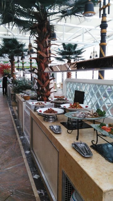 地址:加州红锦大道人民银行对面环境:阳光西餐厅在五洲大酒店的5楼,面积比较大,全玻璃的幕墙和房顶,由于是全透明的玻璃屋顶,上面还有遮阳布,不用担心被太阳晒。大厅里种着很多热带的棕榈树,靠窗边的都是沙发桌椅,中间的是方形的小桌椅。服务:特别好!服务员都很有礼貌,很多小细节上做得很好,值得其他自助餐餐厅学习,在吃海鲜的时候,给客人提供一次性手套,湿纸巾。还有一些海鲜提供加热服务,服务员说:因为有的客人肠胃不适应生冷的,所以他们都可以再加热一遍。饮料酒水可以自取,服务员也会端过来,很方便。换渣盘很勤,用餐完毕后还会送客人一份点心,送客人到门口按好电梯,还会询问你的建议和意见,态度实在太好了,服务周到。菜品:海鲜种类有几种,刺身品种较少,但都很新鲜,最好的是他们这里的海鲜还有川式做法,可以麻辣爆炒,还特别喜欢吃他们五洲特有冷卤海鲜,味道很好吃,中餐的菜品有辣有不辣的,荤素菜的搭配蛮合理的,我喜欢吃麻辣腰片,腰片切得又薄又大片,麻辣味适中。还有重庆小火锅,本地面食,蒸菜里面的花生好吃。最后他家的哈根达斯有4种口味的,不限量供应哟。价格:原价198元的晚餐,现在优惠价是168元一位。总体评价:自助餐餐厅服务相当很不错,很多海鲜可以用川式做,有自己的特色菜品,环境明亮整洁特别舒适。很愉快的用餐过程,希望以后有机会再去。