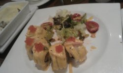 听到“黄袍加身”这个名字,是不是感觉非常有气势呢?但这应该不属于中式做法的菜品,类似寿司卷,再配上蔬菜装盆,视觉上的吸引比较多点。黄黄、绿绿的,上面有点橘色的鱼子再做点缀。第一印象给人以精致、亮眼的感觉。吃起来,奶油味比较浓,就是改良过的寿司卷,价格偏小贵。不过这个的点击率比较高。比较大个,很容易饱。查看更多