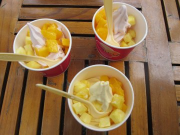 ‘’优果乐园 YOGO‘’,位于新天地里面,蛮好吃的一家冰淇淋店,生意蛮好的,要排队买的,可以堂吃,也有露天位的,我们三姐妹买了3个一样的,菠萝加芒果,蛮甜的,好好吃哦,水果放了不少,冰淇淋的味道也非常纯真