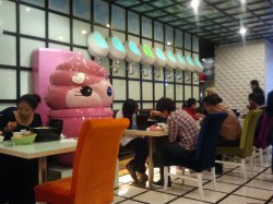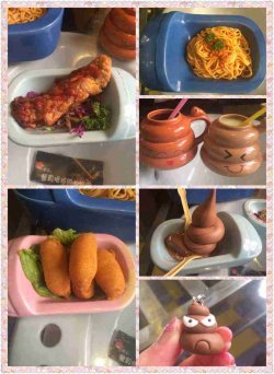 在西直门五层逛街偶然看见这家便所主题餐厅,看着非常有意思,就进去尝尝吧。平常人不多,一般在周五或者节假日等位的人比较多。进去就是一个便便的世界了,墙壁上便便的图片为什么看着像糗百捏。座椅也很有特色,竟然是一个大马桶,坐上去竟然有那么点马桶的感觉!室内布置自然也少不了便便,一个粉色的大便便映入眼帘,在这吃饭果然是靠情趣的。菜谱里是按照西餐来的,黄金便便条就是最右边那个金色的大胖子,其他是正常的油炸小吃。点了份意面,说实话味道真的很一般,是我吃过意面里排倒数的,看着盘子也是马桶盖的样子,挺多吃个新奇吧!这道巧克力便便冰淇淋是我特别期待的,结果不负众望,果然很像很像,本来想要纯巧克力的,结果朋友死活拦着,哈哈。最后说一下,餐厅里面挺大的,走到最里面是隔间,样式竟然是参照浴室做的,还有喷头立在上头,和朋友出来玩来着可以图个新奇,味道就不要奢望了,点了几道菜基本都很一般般。查看更多