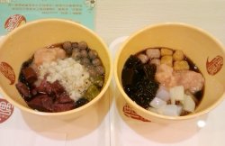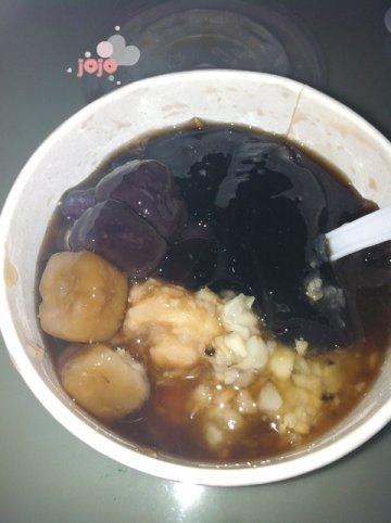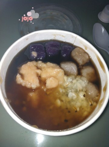 点了招牌芋圆,料有芋圆,绿豆,紫薯,红豆珍珠,仙草~紫薯口感就是不如山芋,会偏干一些,甜度萌萌说有点过甜,我觉得还好;右边一大坨透明中包裹着红色东东的珍珠是店里特色的 红豆珍珠,这种包芯红豆珍珠有个好听的名字,叫龙珠~Q弹中带着红豆甜香,很喜欢~除了红豆龙珠,还有绿豆龙珠。这家芋圆很不错,口味够多绿茶芋圆 香芋芋圆 芒果芋圆 等 萌萌点的仙草diy18块钱 自选5种料很明显她这碗芋圆是主打这家仙草味道很喜欢,香气足味道浓~而且别看碗不大 一碗吃完,特有饱感~