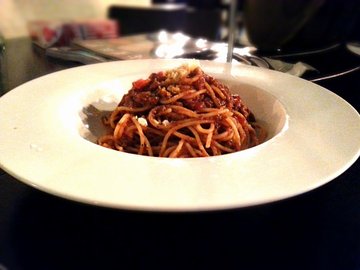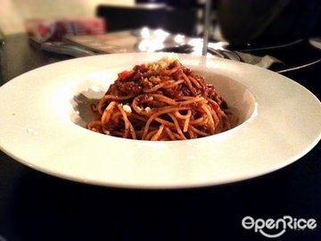 灯光较暗,带着一点意式风情。深色简单桌椅,深灰地板,有一面砖墙。坐下来店员放下菜单后就不理了。自已跑到柜台去验了证。然后几分钟之内一下子上齐,怀疑是事先做好的。也没有白水提供。克拉美雪肉酱意大利面(38元):面条口感还行,可是那个肉酱咸得很,没什么鲜味。前菜可以6选1。奶油蘑菇浓汤(25元):较浓稠,感觉是用粉冲出来的,而且味道留在嘴里有股子说不出的感觉,难喝。暖心粗粮热饮(25元):也是冲出来的,红枣的,较为甜,一股。总体感觉较差,吃完后觉得口好干,这加了多少味精啊?