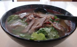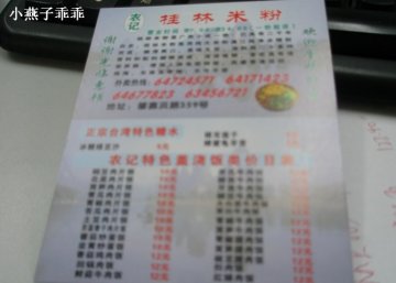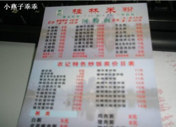 桌椅虽较廉价,但很新。店面不大,七、八张桌子。绿色的墙壁,红色的灯笼,较俗气。墙上挂着一些关于米粉的介绍。只是地上、桌上都没人收拾,到处是废纸巾和一次性筷子。门口就是收银台。去的时候差不多二点了,收银员靠在墙上昏昏欲睡的样子。要别人提醒,才不情愿地收银。店内除粉面外还有炒饭、粥、盖浇饭之类。种类不少。价格都不贵。断断续续有人进来吃饭。选了牛肉粉:上的很快,估计浇头是现成的。牛肉片不少,还配有花生、酸豆角和生菜,同一般的桂林米粉店差不多。汤有些奇怪的香味,还可以,可能加了不少香料做成。米粉很弹很Q,是我喜欢的口感。牛肉片较软烂,只是味道较淡。一旁放置着辣椒酱,较浅色的那种辣味很正,也非常辣。总体感觉一般。