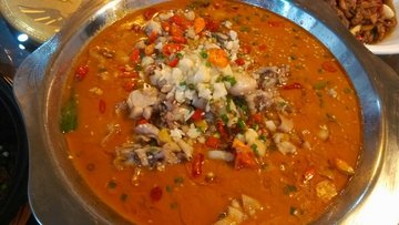 环境一般般,但是东西还是蛮好吃的。好大一锅的牛蛙,而且放了好多辣椒。吃起来口感还是不错的,肉挺鲜嫩的,口感挺好。不过味道确实很辣,不能多吃。还有太极图,就是炒小黄鳝,看上去有点恐怖我不敢吃,不过朋友们吃的很开心的说,而且说很好吃的呢。他们的生意还是蛮好的人很多。