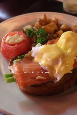 周末就该属于慵懒,一觉睡到自然醒,然后找上一家喜欢的餐厅去享受一餐优雅的Brunch,会是多么的完美!KABB位于新天地一隅,环境清新,虽然是夏日,露天位依旧比室内来的更受欢迎,而老外们占了其中的大部分。中午时段有Brunch,点任意一份主食,即送一杯软饮或者咖啡,选了招牌的烟熏三文鱼水波蛋和冰红茶。冰红茶的大玻璃杯上印有KABB的Logo,冰块加的分量不多,糖水另外分开自己根据喜好添加,冰冰凉凉的很适合夏天。烟熏三文鱼水波蛋非常大的一盘,两个水波蛋,四片烟熏三文鱼,四根芦笋,一大片烘烤过的厚切面包片,以及一个芝士番茄和一大份培根炒土豆,口味总体偏清淡,内容丰富,美味而营养。水波蛋是半生的,嫩滑的口感,配上芝士的香浓,果然是招牌。烟熏三文鱼口感很棒,卷着底下的芦笋吃起来更赞。培根炒土豆因为加了黑胡椒来调味,所以口味稍微偏重。芝士番茄看似普通,香浓芝士是水嫩番茄的完美点缀。查看更多