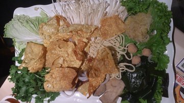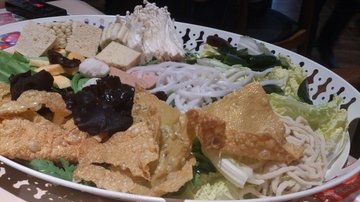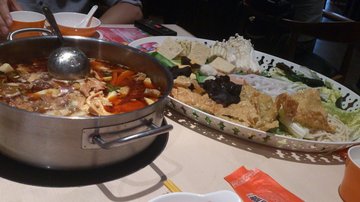 同事嚷嚷着要吃火锅,在网上搜了下,正好万达这家有团购,就团了个119元的三人餐,中午的时候人还不是很多,去了四个人,服务员说再加两块钱的餐位费,另外调料和从前也不一样了,现在是5元钱一份的自助,原来店里供应的免费贩爆米花已经被辣萝卜条和辣白菜取缔了,其它的调料和火锅类的店差不多,于是又另交了20块钱的调料费。团购说的是1.6斤的肉,1.2斤的土豆,反正都已经放在锅里的,也看不出来了,还有一个大大的象一个餐盘一样的拼盘组合,包括虾丸、牛丸、冬瓜片、甜玉米、干豆腐、秋木耳、炸豆腐皮、酸菜、鲜金针蘑、茼蒿、自制粉、生菜、大白菜、冻豆腐、手擀面等待好多,看起来很超值的样子,而且摆放的也很漂亮。肉端上来的时候已经是熟的了,土豆和其它的菜需要煮一会儿,之所以喜欢来这家的原因也无外乎是肉虽然软烂,但不失劲道,汤底虽然是辣的,但吃起来并不是很辣,同事也很喜欢喝这个汤,闻起来也香香的,其它的配菜并没有什么惊艳的地方,手擀面还不错,四个人本来怕不够吃,又点了两碗米饭,结果最后也没有吃光,总之,还是一家不错的店。…查看更多