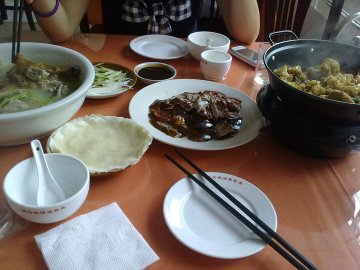 这家点经常搞买一送一的活动~就是你去吃烤鸭~送你券~你下次可以免费再吃一次~不过下次吃的时候要再点个菜就好啦~我感觉是挺划算的~上图这个技术烤鸭~烤的还是比较香~酱不咸~口感不错的啦~这是鸭架汤~你可以选把鸭架做成汤或者抄成椒盐的~我觉得汤好吃一点~这是干锅花菜~一般般~不难吃全貌图~比较划算~两个人吃没吃完~应该三个人吃的